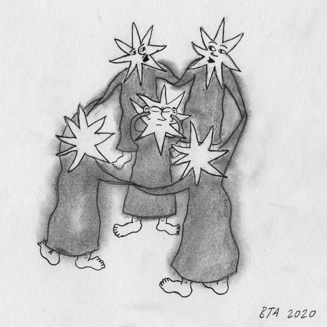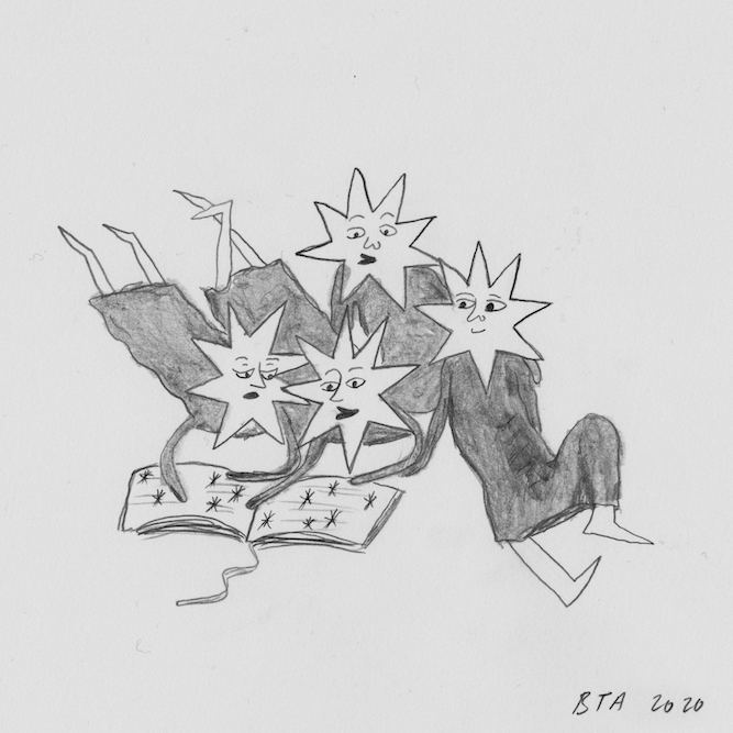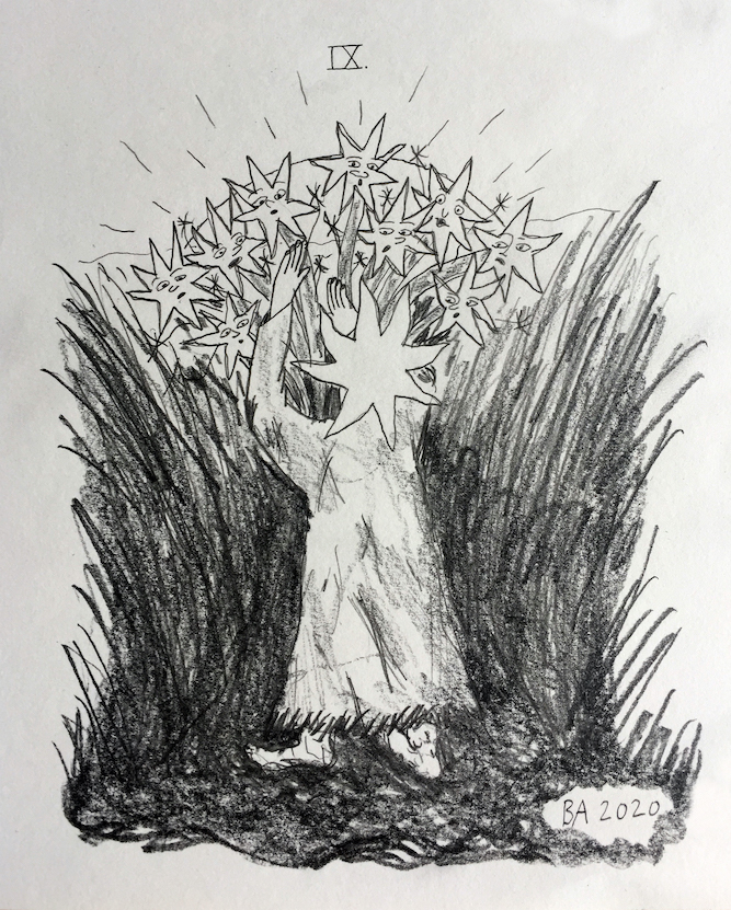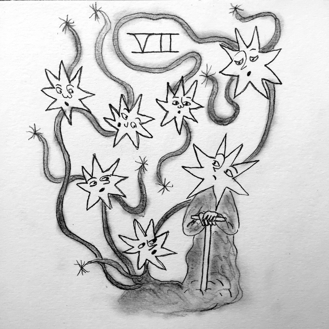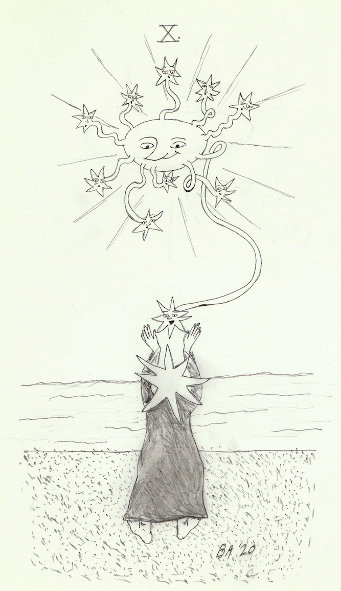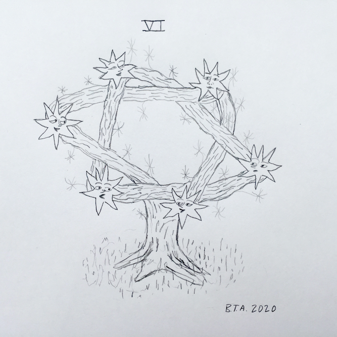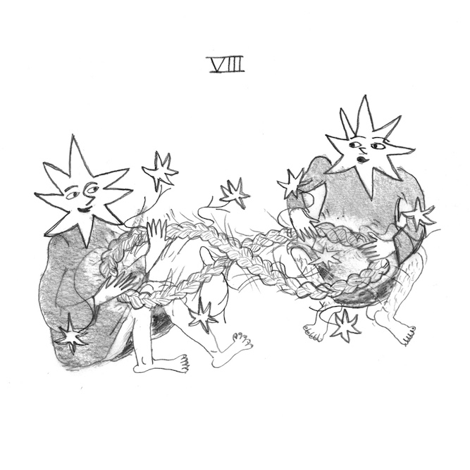 A visual language, inspired by classic interpretations of the numerical processions found in the tarot, was developed in drawings I made to accompany each episode. These depicted hybrid figures made of stars, people and plants.