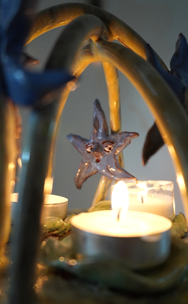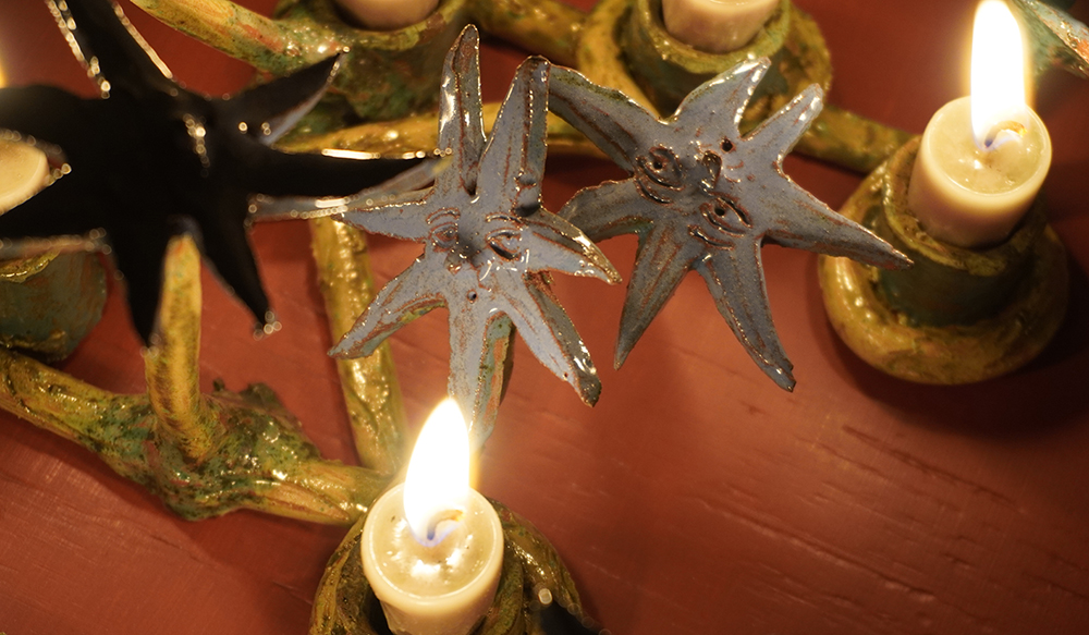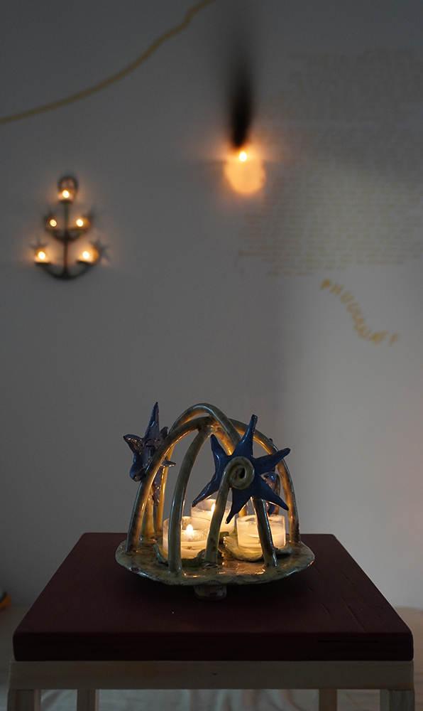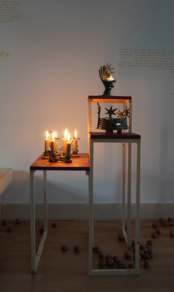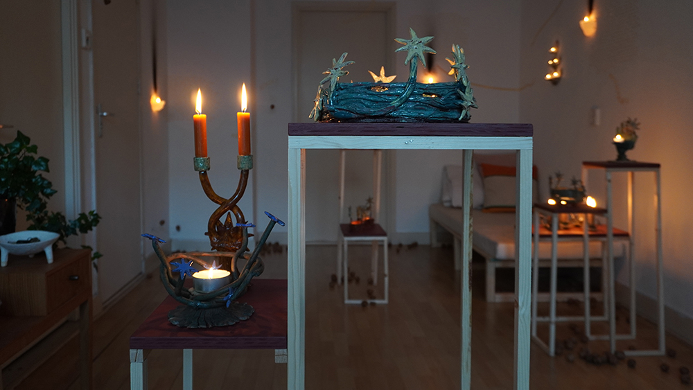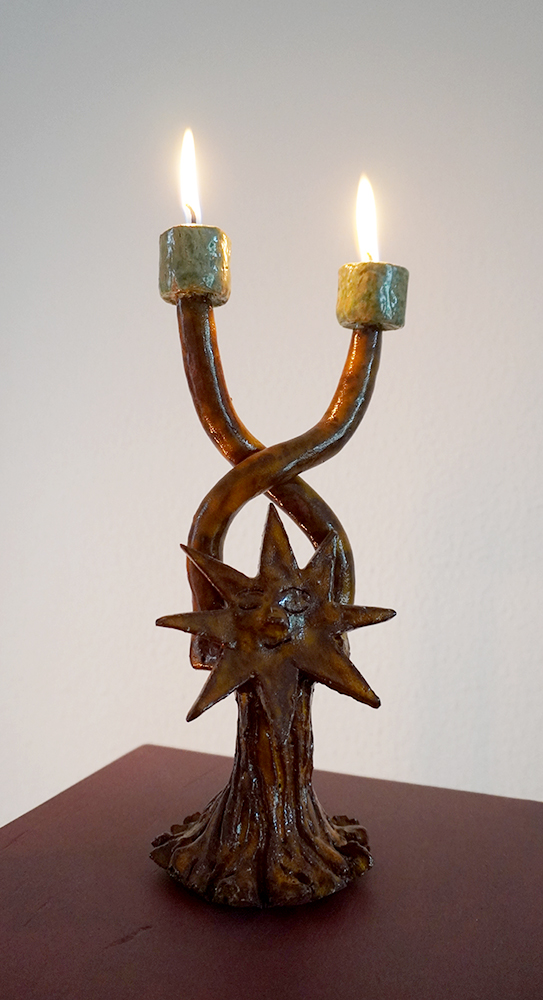 We follow hybrid beings; part stars, part flowers, part trees, part humans, and part candle-holders in their self realisation and increasing complexity. They are spirits singing, growing, learning; illuminating each other and the rooms they inhabit. Harbingers of fortune, present mirrors and remnants of past hurdles — stories braiding, folding, coiling and branching out as domestic reminders of our communal and cosmic narrative.