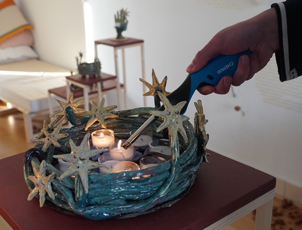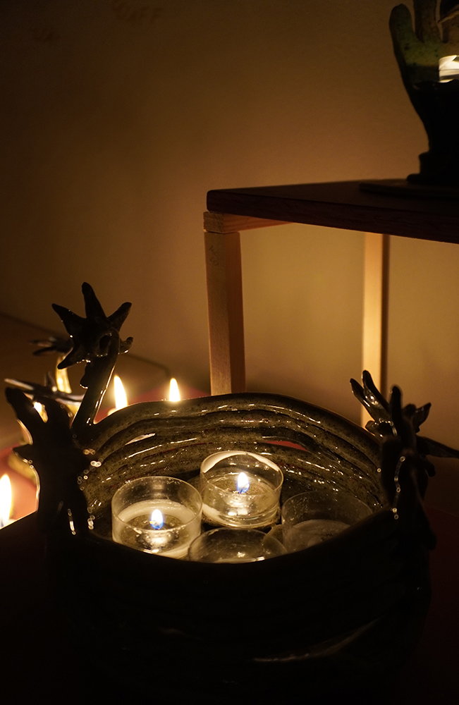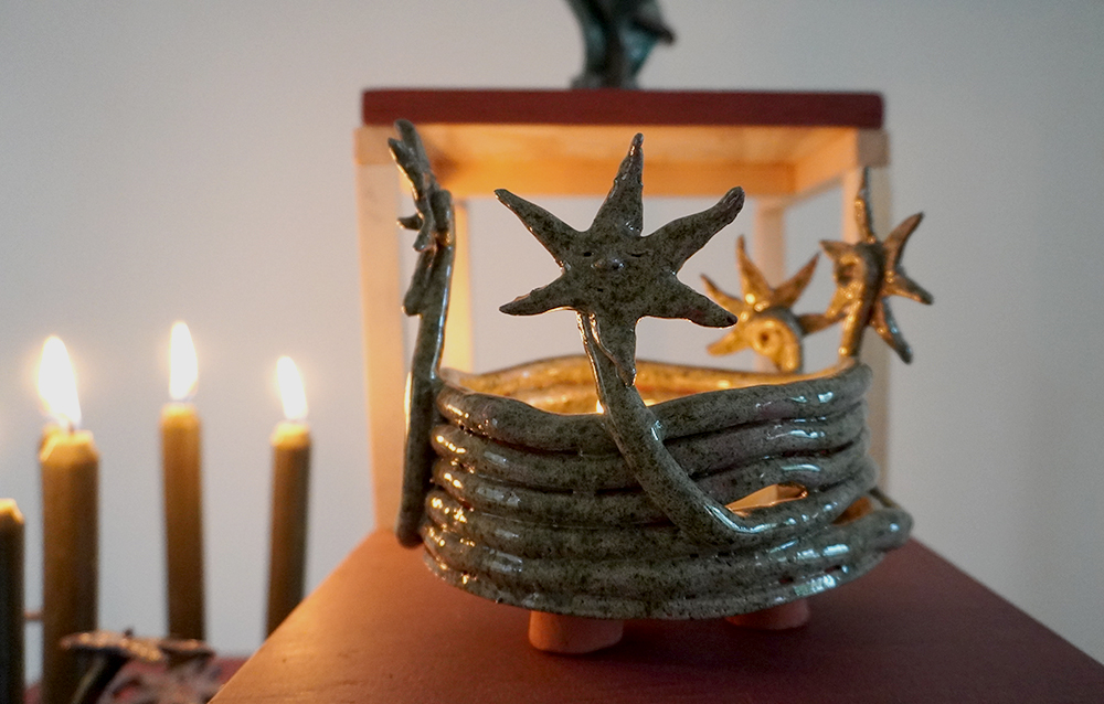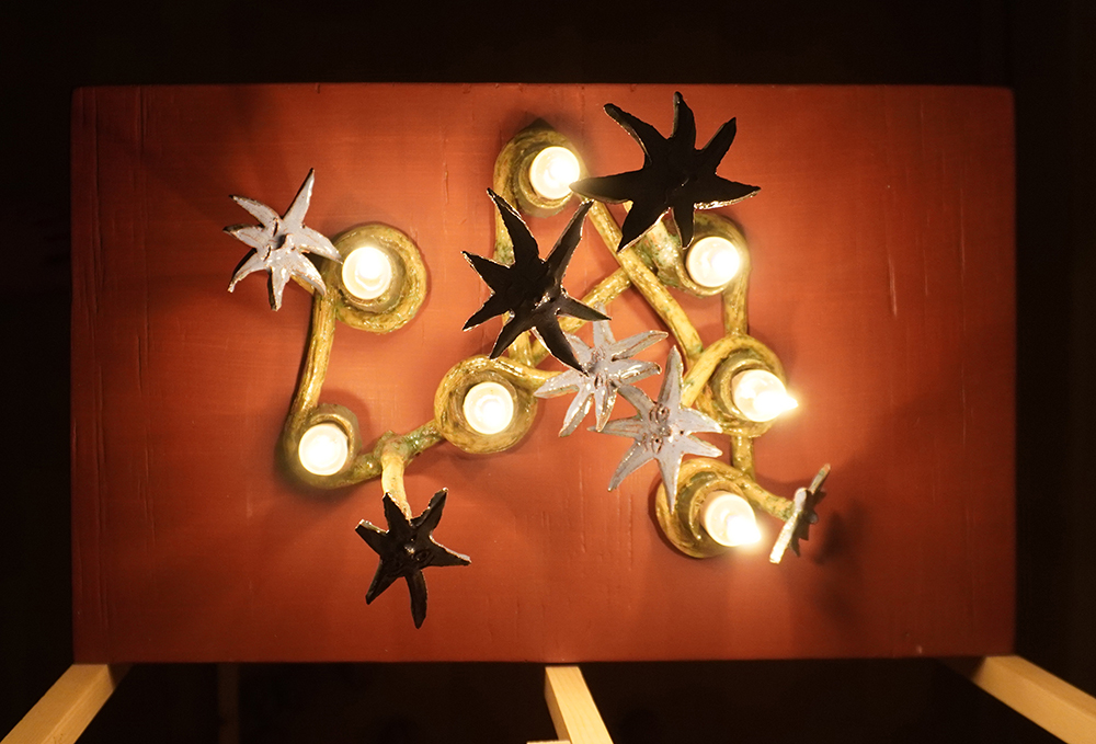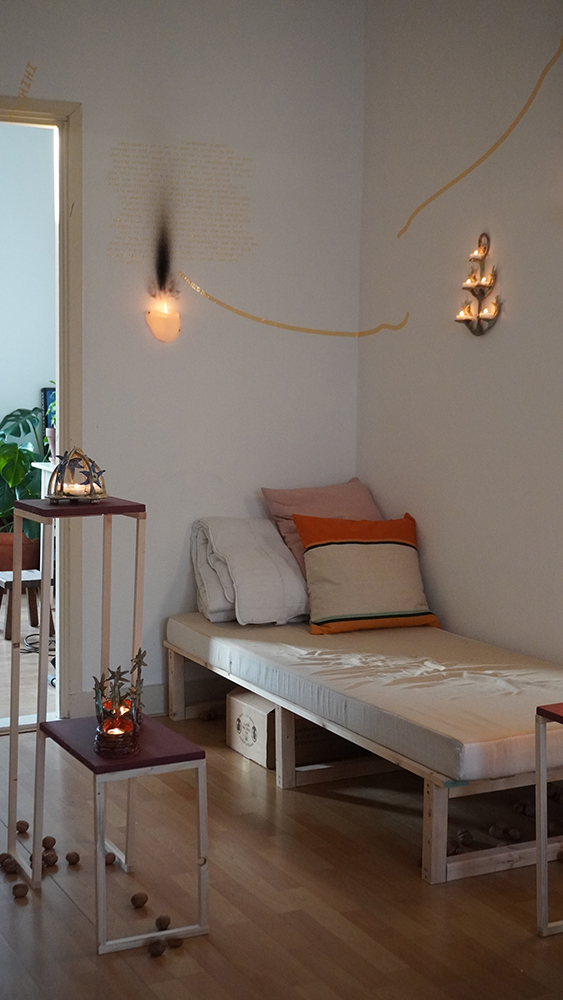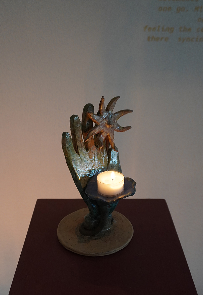 We follow hybrid beings; part stars, part flowers, part trees, part humans, and part candle-holders in their self realisation and increasing complexity. They are spirits singing, growing, learning; illuminating each other and the rooms they inhabit. Harbingers of fortune, present mirrors and remnants of past hurdles — stories braiding, folding, coiling and branching out as domestic reminders of our communal and cosmic narrative.