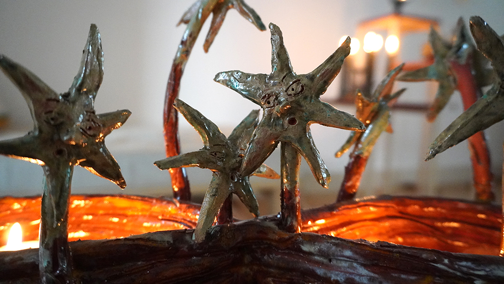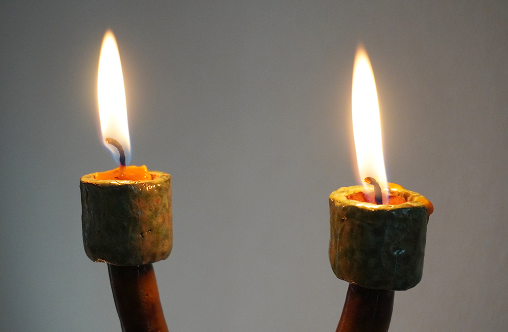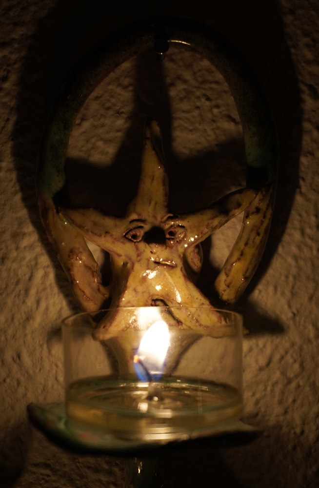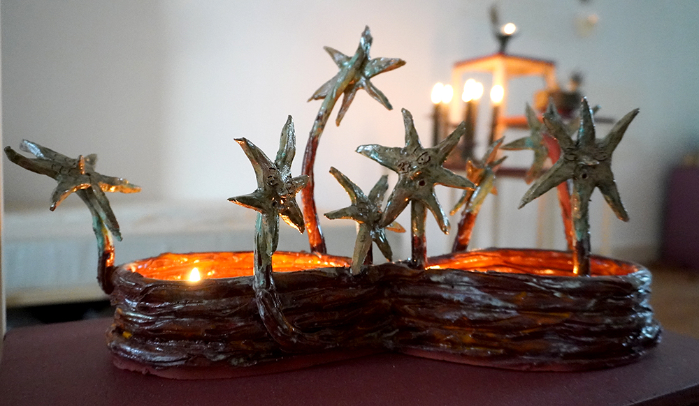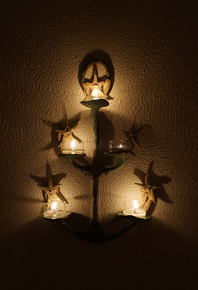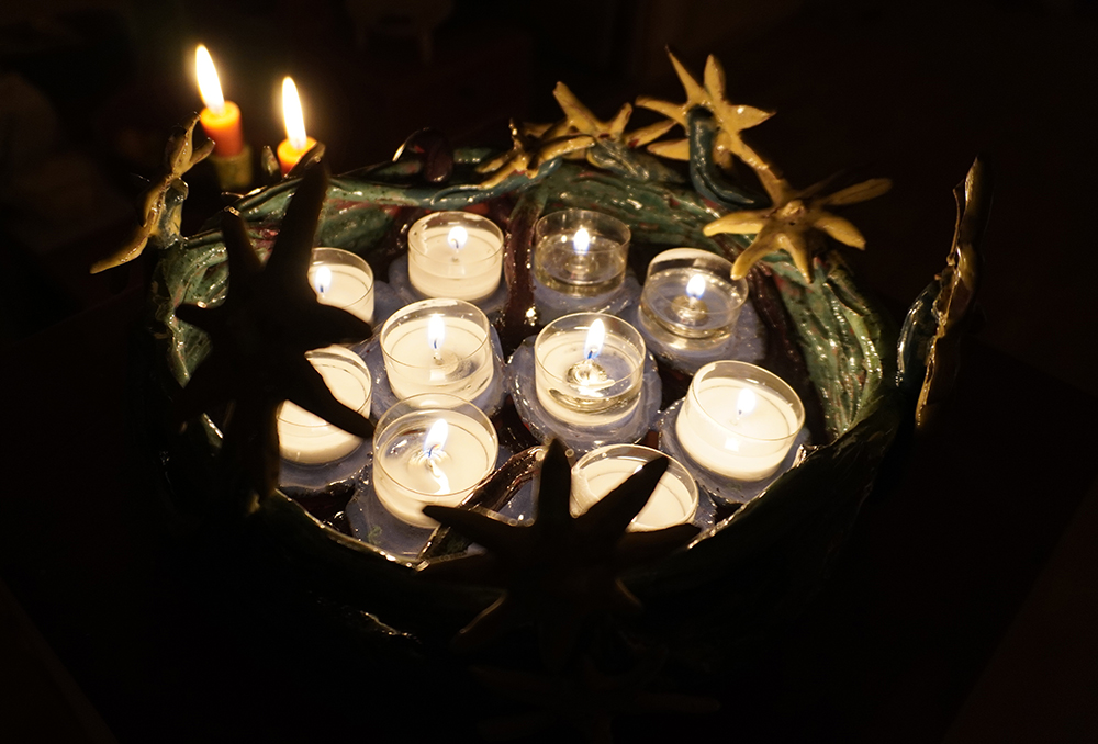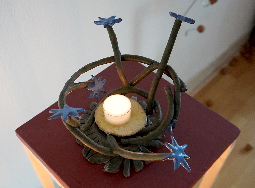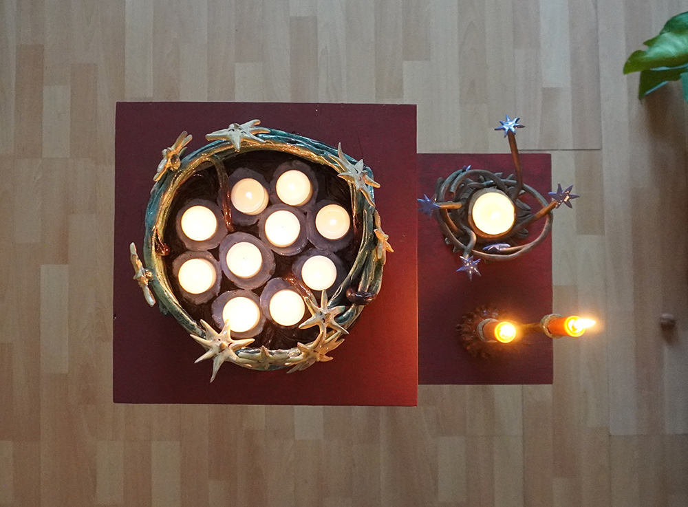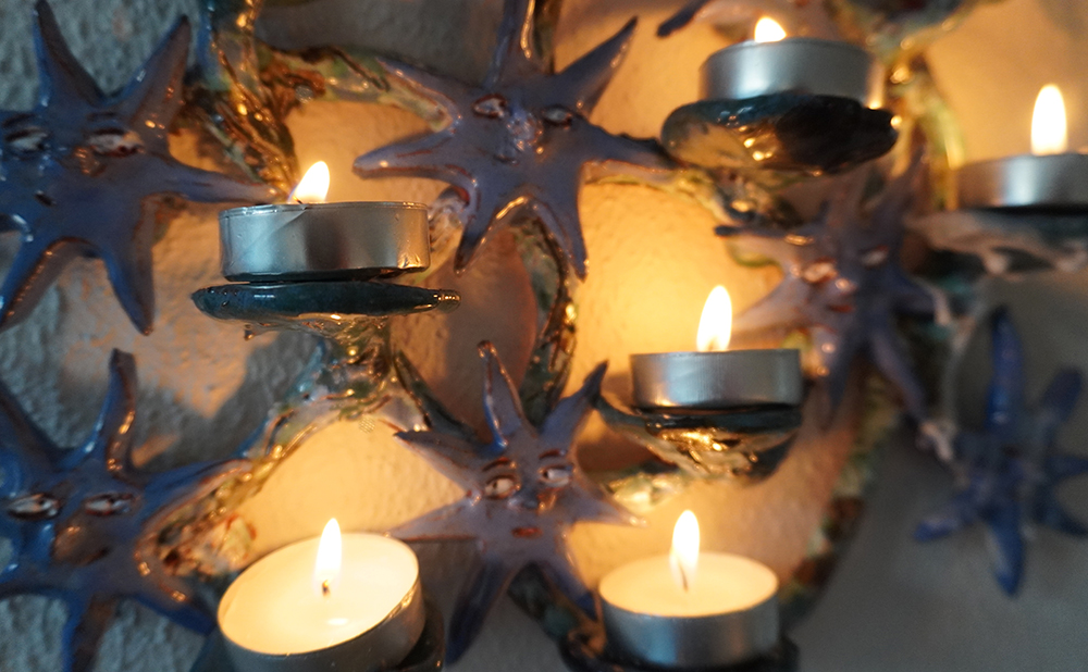 10 glazed ceramic candleholders, candles, collaborative flag piece